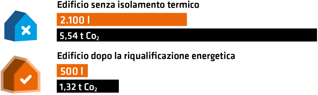 Superficie riscaldata 200 m² Fabbisogno per riscaldamento 4.000 l Heizöl (= 20 l/m² e anno) Interventi di risanamento energetico